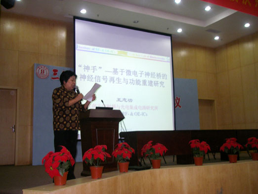 王教授简述了东南大学射频与光电集成电路研究所的三大研究方向:无线通信集成电路、光纤通信集成电路和神经桥接集成电路,并就其中融合的 “微电子神经桥”的结构、功能、未来发展前景进行了详细生动的阐述。他们的实验实现了北京和南京两只蟾蜍千里之外的互感互动。如今这项实验有了新突破——一名健康人控制另一人的手部及手臂活动已经成为现实,偏瘫病人能用自己健康的手“指挥”已瘫痪的手动起来,一名学生在另一人的“控制”下弹起了电子琴。这项技术的未来将向语言控制、意念控制发展,类似“阿凡达”那样用精神力量,比如意念,控制一个“替身”也成为可能,对我国乃至整个世界有重要的影响。
