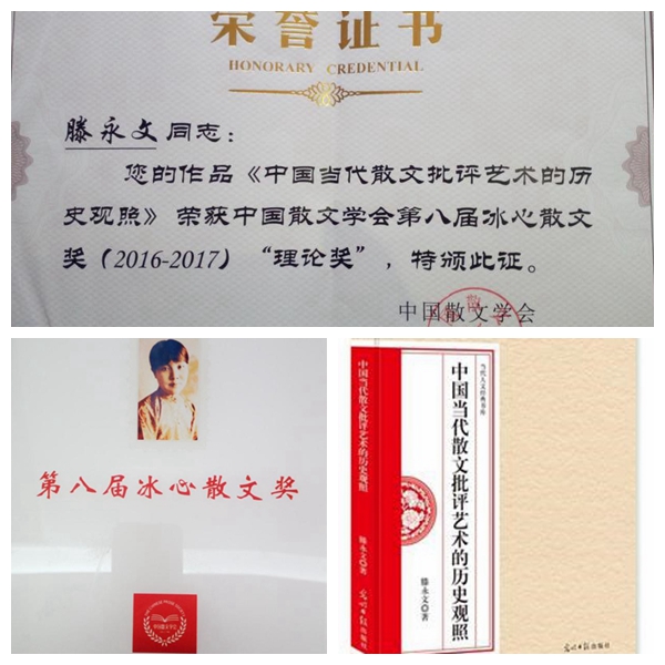 6月23日,备受瞩目的第八届冰心散文奖颁奖典礼暨中国散文高峰论坛在四川省眉山市隆重举行。我校文新院滕永文教授报送的专著《中国当代散文批评艺术的历史观照》(光明日报出版社出版)荣获冰心散文奖散文理论奖(排名第一)。