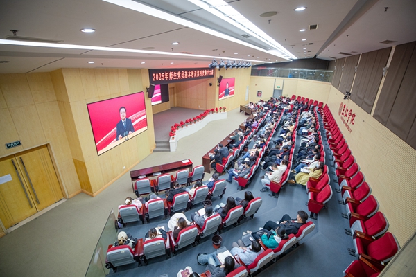 12月19日,我校举行2025年师生党员基本培训第四次集中培训课。全校党员集中收听收看中央党校(国家行政学院)党的建设教研部副主任祝灵君教授关于《深入学习贯彻习近平总书记关于党的建设的重要思想》的专题报告视频。本次集中培训主课堂设在三江会堂,学术报告厅、南校区、东校区分别设置了分课堂。全校近1000名师生党员参加了集中培训。理事长、党委书记封超年主持培训并讲话。