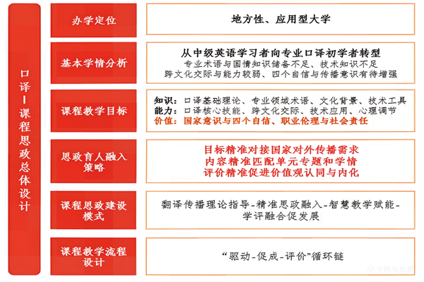 本课程坚持以“精准思维”为指导原则,紧密对接三江学院“地方性、应用型”办学定位与新文科背景下英语专业语言+传播+领域知识的复合型人才的培养路径,系统推进课程思政建设,深化课程思政内涵,明确以“强化国家意识、增强四个自信、讲好中国故事、传播好中国声音”为思政建设方向和重点,以服务国家对外传播战略为目标培养高素质应用型口译人才。着力培育学生坚持中国立场、密切联系世界的跨文化传播能力,提升学生综合能力,实现价值塑造与专业素养的协同发展。