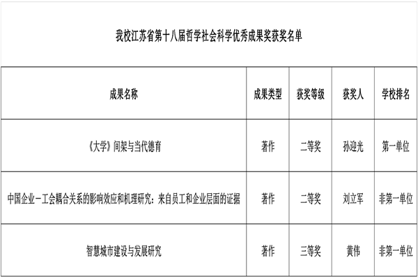 近日,江苏省人民政府正式印发《省政府关于公布江苏省第十八届哲学社会科学优秀成果奖的决定》(苏政发〔2025〕106号),全省共计738个项目获奖,其中一等奖117项、二等奖296项、三等奖325项。在本次评选中,我校共3项成果获奖,第一单位1项,非第一单位2项,包括二等奖2项、三等奖1项,其中孙迎光教授团队以第一单位获二等奖1项,是我校在此奖项上的历史性突破。