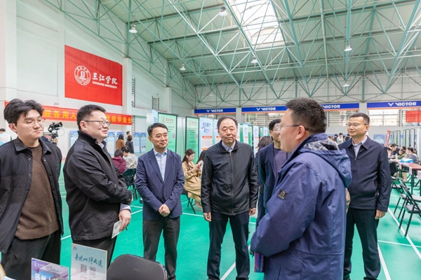 4月2日,“职引未来”2026年全国城市联合招聘高校毕业生春季促就业攻坚行动三江学院专场招聘会在我校铁心桥校区体育馆举办。本次招聘会由江苏省人力资源和社会保障厅、江苏省教育厅主办,江苏省劳动就业管理中心、江苏省高校招生就业指导服务中心和三江学院共同承办。省劳动就业管理中心副主任吴昊,省高校招生就业指导服务中心副主任蔡亮,我校理事长、党委书记封超年和党委常务副书记、副校长周更生到会场调研指导工作。有关职能部门负责人、二级学院负责人、专业课教师、辅导员均到场与用人单位和应聘毕业生交流,了解聘用需求并掌握学生应聘情况。本次招聘会规模大、覆盖广、服务精准,吸引了我校数千名毕业生踊跃参与。