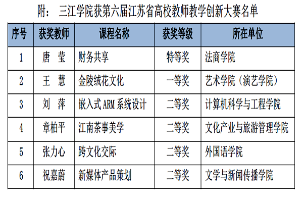 近日,江苏省高等教育学会发布《关于公布第六届江苏省高校教师教学创新大赛获奖名单的通知》,我校选送7位教师参赛,勇夺6项大奖,获奖率高达85.71%,其中特等奖1项、一等奖1项,二等奖4项(见附件),位列全省民办高校和独立学院第一。