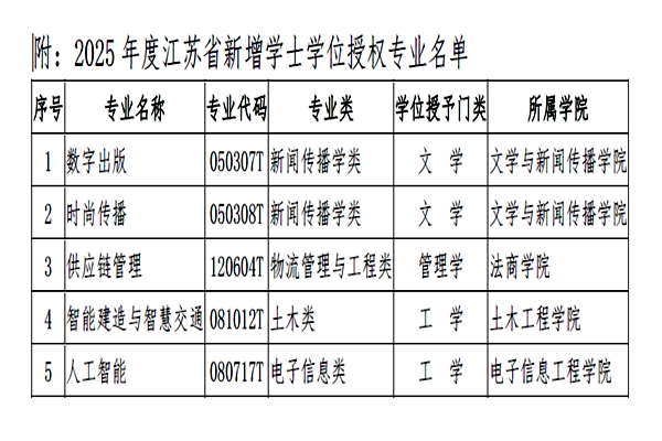 近日,省学位委员会、省教育厅正式发布《省学位委员会 省教育厅关于公布2026年度学士学位授权专业审核结果的通知》(苏学位字函〔2026〕1号),我校数字出版、时尚传播、供应链管理、智能建造与智慧交通、人工智能五个专业获批增列为学士学位授权专业。至此,我校在招学士学位授权专业达到47个,涉及工学、文学、管理学、经济学、法学、艺术学等六大学科门类。