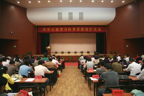 10月22日下午2时30分,我校中心组学习科学发展观扩大会在三江会堂举行,校理论学习中心组成员、全体教职工党员、辅导员、科级以上干部出席。校长、党委书记陈万年主持学习会,副校长、党委副书记董新华做关于科学发展观的辅导报告。