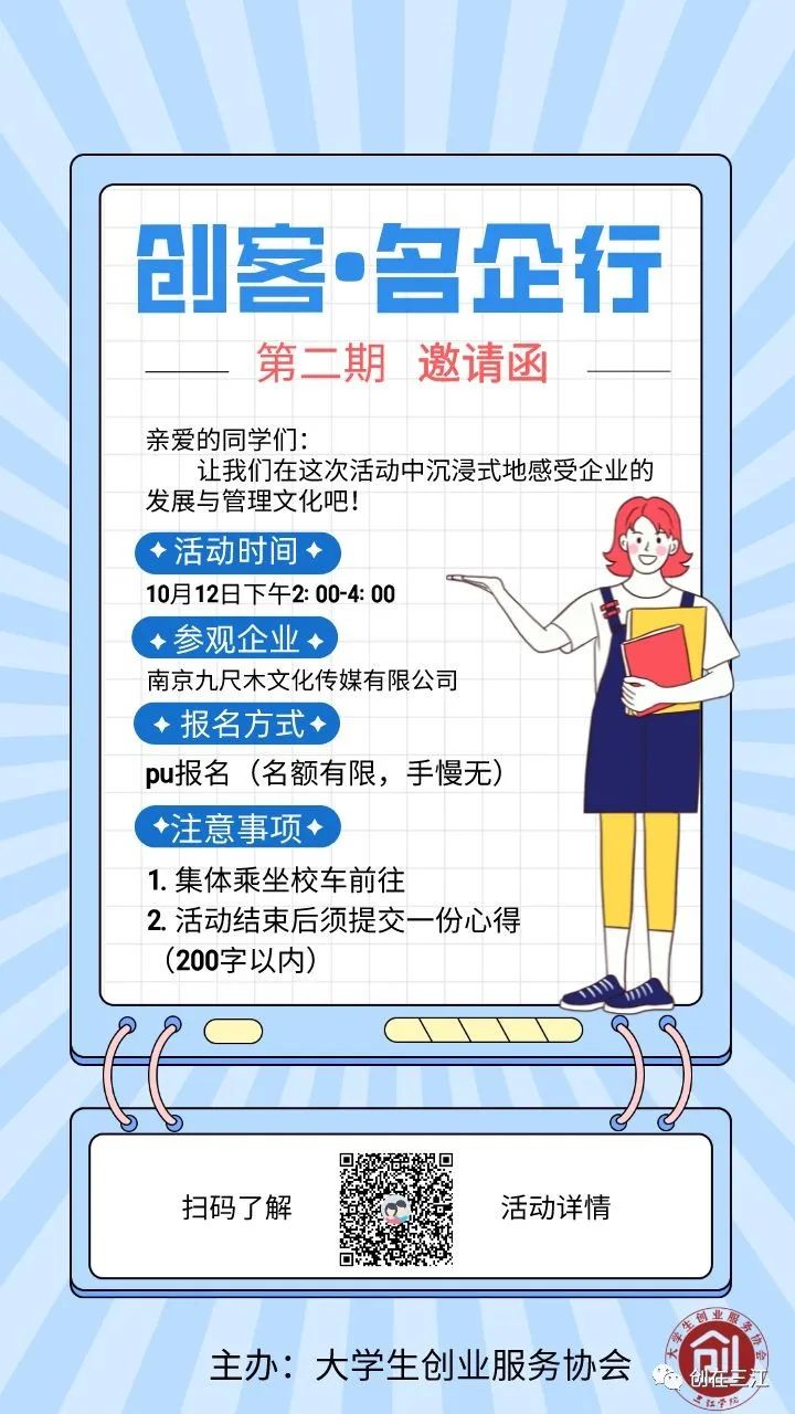 为积极响应学校号召,发挥社团优势,促进交流。大学生创业服务协会开展了“创客·名企行”特色活动第二期。本次活动我们一起走进南京九尺木文化传媒有限公司,沉浸式感受企业创新创业文化。在观察中体验,在实践中收获,在担当中成长。诚邀广大同学积极报名参加!