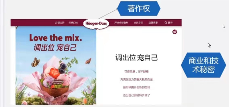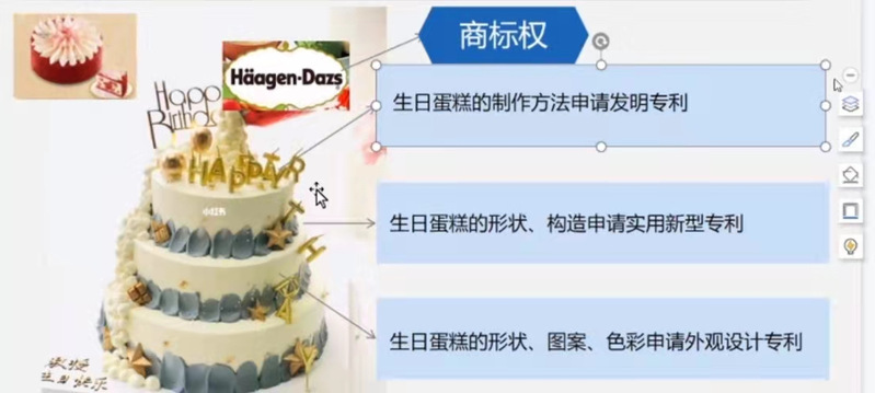 接下来,巫老师用一张关系图直观地表示了三种不同知识产权之间的区分。凡是能生成实用新型保护范畴的技术方案理论上可以申请发明专利,为了帮助同学们理解在实际案例中申请哪类专利,巫老师用蛋糕、品牌生动形象解释知识产权的区别。