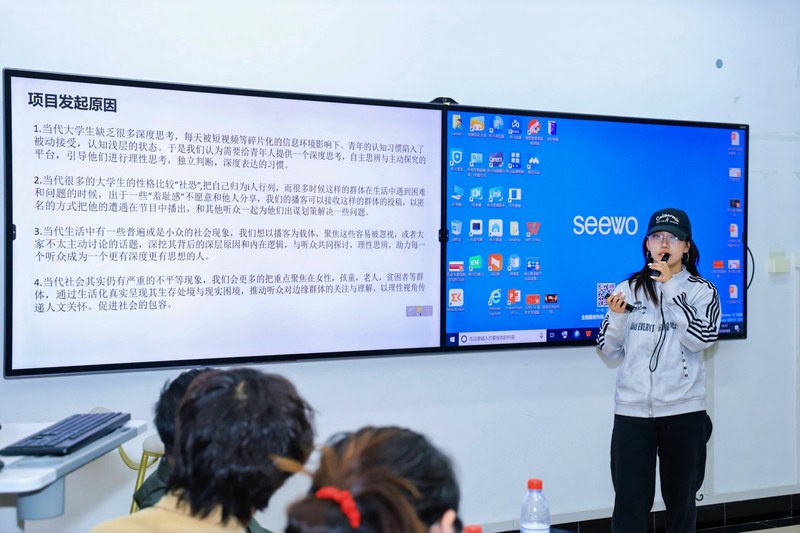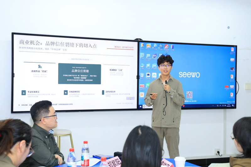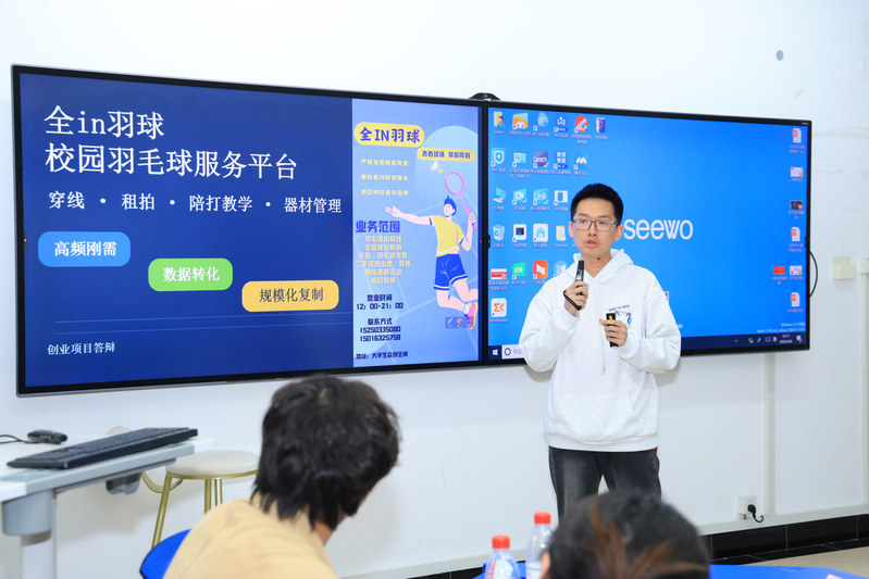 答辩现场,各创业团队依次登场,带来了涵盖营销策划、科技、校园服务等多个赛道的创新构想,亮点纷呈。其中,聚焦营销策划领域的项目,以健康产品为核心赛道,依托成熟供应链,精准布局江苏市场,通过专业策划与精准营销,推出贴合用户需求的健康产品;立足AI技术的科技类项目,瞄准化妆场景核心痛点,通过面部精准识别技术,实现智能试妆与专业教程指导双重服务;深耕校园场景的实干型项目,以羽毛球穿线服务为切入点,整合陪练教学、器材流通等优质资源,构建起完善的校园运动服务闭环。此外,关注青年深度思考的校园播客项目、专注电竞赛事服务的特色项目,凭借独特的市场视角、清晰的发展规划,也成功吸引了评委老师的重点关注与专业点评。